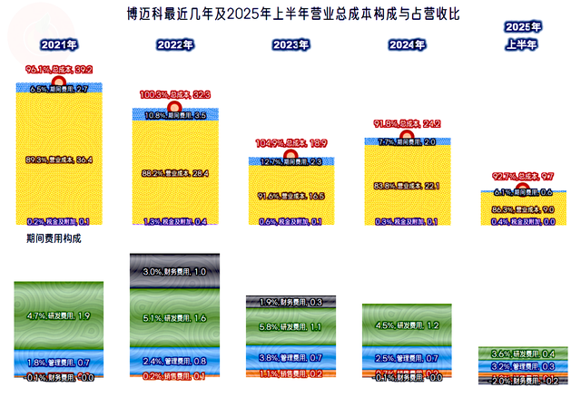 从主营业务来看,2021年的盈利空间是3.9个百分点,2022年是保本略亏的状态,2023年的主营业务亏损近5个百分点。2024年和2025年上半年的主营业务盈利空间有七八个百分点,主要得益于毛利率反弹和期间费用占营收比下降。